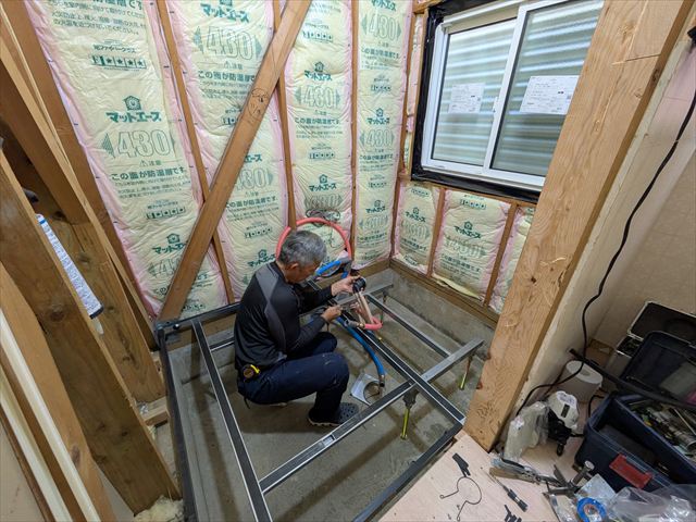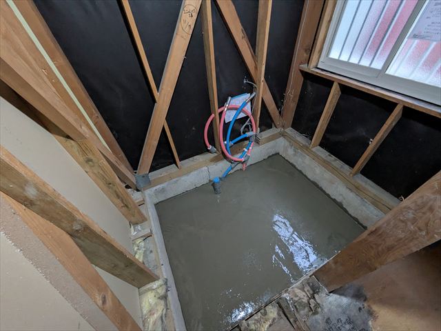 既存浴室が1階なのに架台式であったので土間の打込みを行っています。
