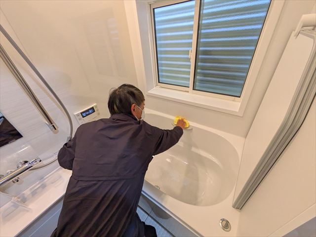 浴室だけでなく搬入経路や玄関扉まで丁寧に洗い上げていきます。