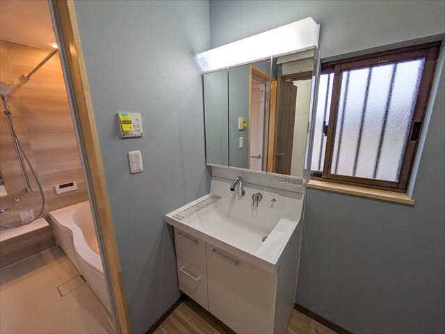 洗面化粧台の向きと配置を交換することで動線が平行になりました。