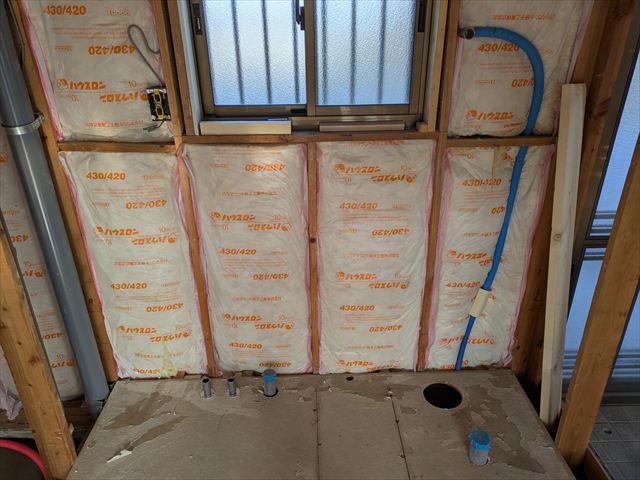 屋内を下地から造り直す事によって配管の位置を変更して設備機器の配置を変えてあります。