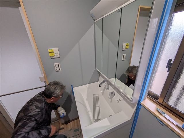 洗面化粧台の側面には水が入り込まないように防水シーリングを打ち込みます。