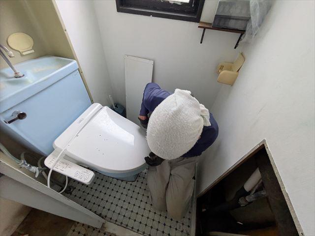 背面の壁をくり抜いてタンクを下げる事でトイレ室に余裕を持たせています。