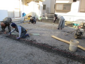 外構工事が始まりました。余分な土を搬出してから砕石を敷き、転圧をかけて整地していきます。