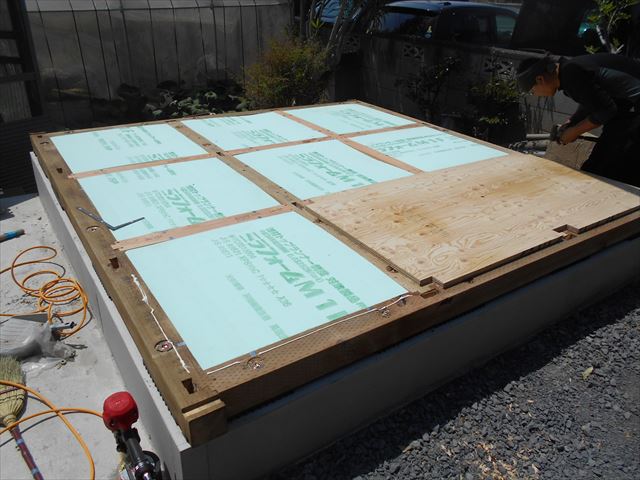 床下には断熱材が施工され、土台や大引きが設置されていきます。