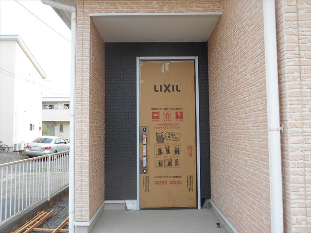 玄関扉が吊り込まれ、アクセントとなる外壁も復旧しました。