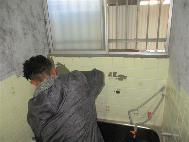 浴室では下地の防水処理と既存タイルの均し作業が進められていきます。