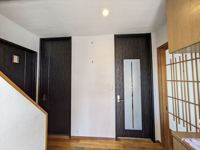 既存の内装建具の表層へ新しくしっかりした素材の化粧デザインシートを張ったリフォームとなっています。