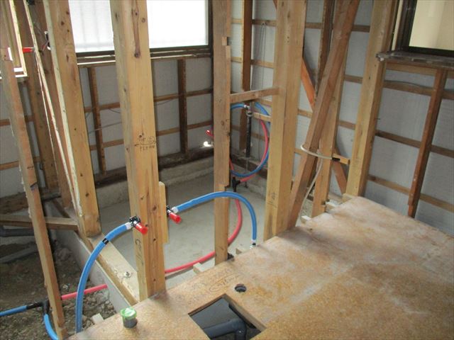 先行して配管や換気扇ダクト、電気配線などを進めていきます。