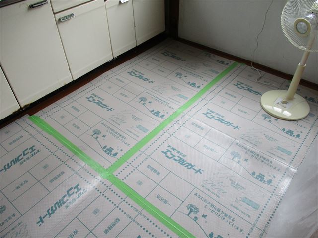 棚や冷蔵庫などにも埃が飛ばないようにシートで覆う作業も同時に進めます。