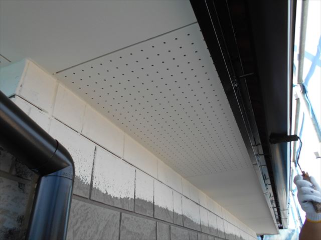 先行して軒天及び破風板と雨樋の塗装を行っています。