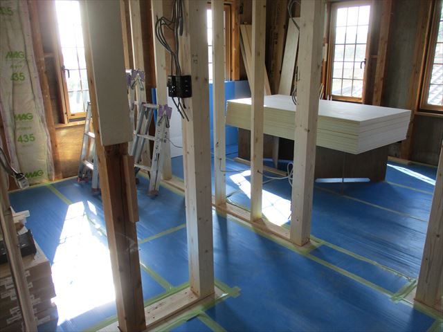 2階のフローリングが張られ、壁や天井の下地が取り付けられていきます。