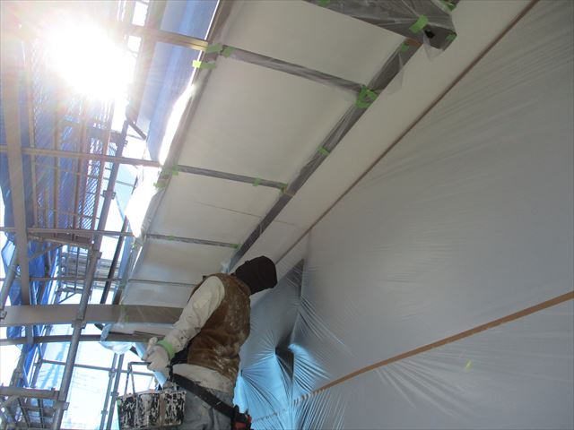外壁に養生を施してから、軒天や破風板の塗装となります。