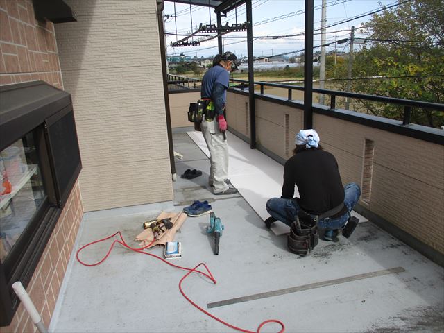 ベランダでは不燃下地の上からFRP防水が施されていきます。