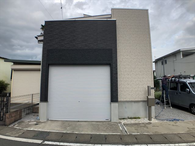 ガレージシャッターを設けて窓や扉も同時に設置することで区画されたガレージとなっています。