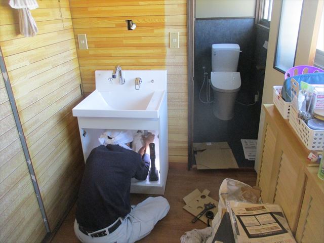 カラン式の水栓から洗髪仕様の混合栓タイプの化粧台に交換となりました。
