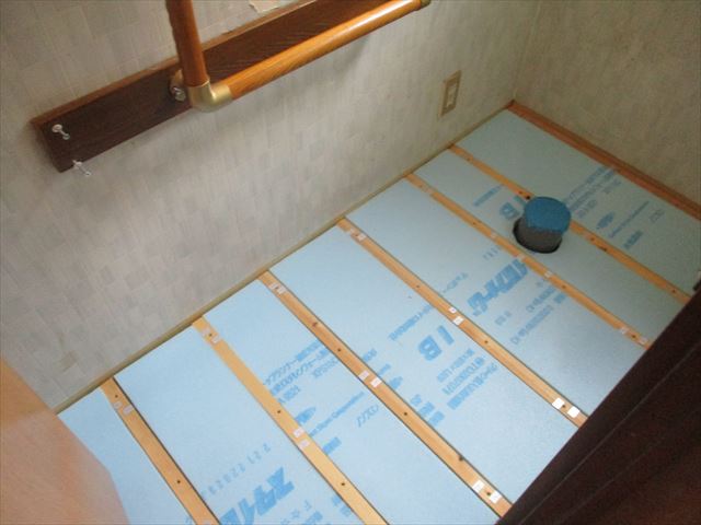 1階トイレ室の段差を無くすように床を二重に組み上げた造作を施しております。
