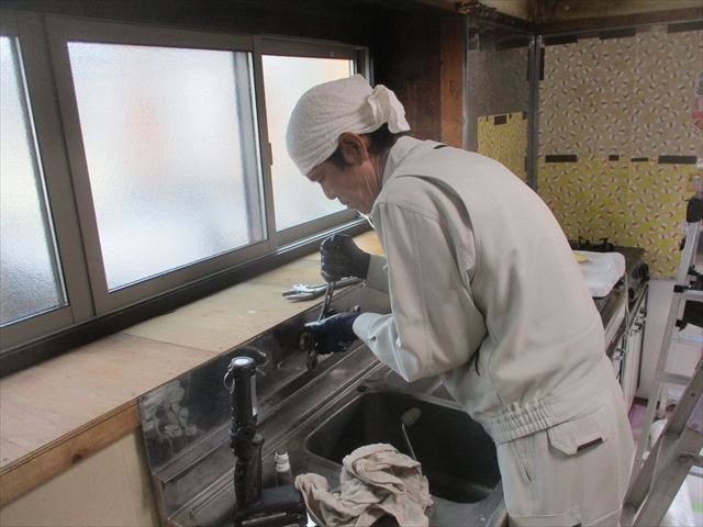 解体作業前に水栓金具や換気扇フード等の取り外しを進めていきます。
