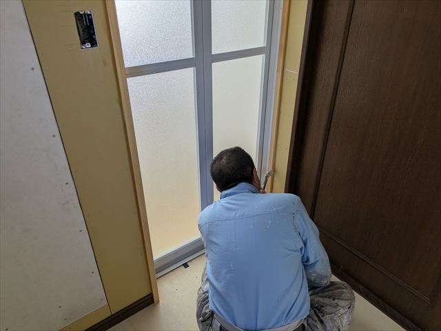 次に浴室の扉枠へクリア塗装が施されていきます。