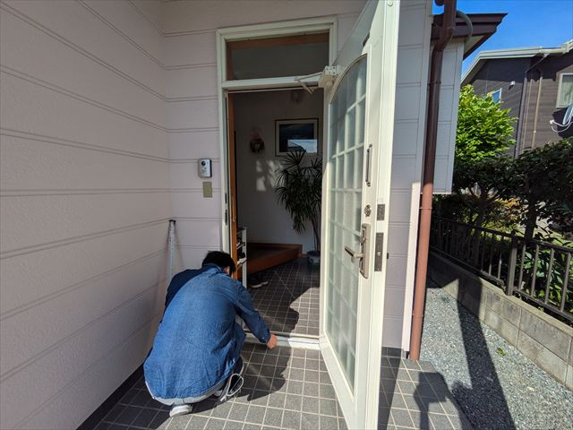 玄関枠と外壁の取り合いに防水シーリングを打ち込んでいきます。