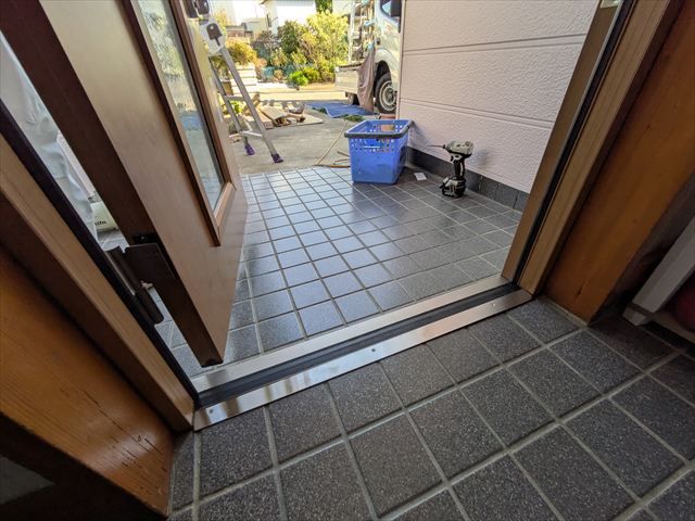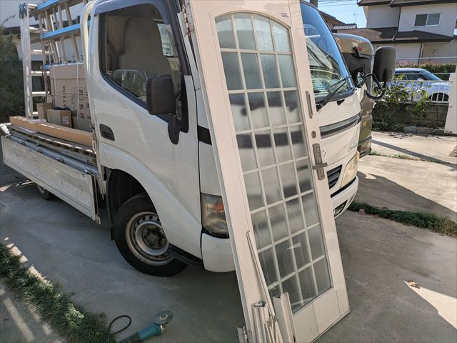 既存の玄関扉と欄間ガラスが取り外されていきます。