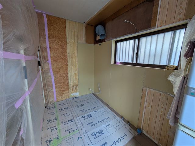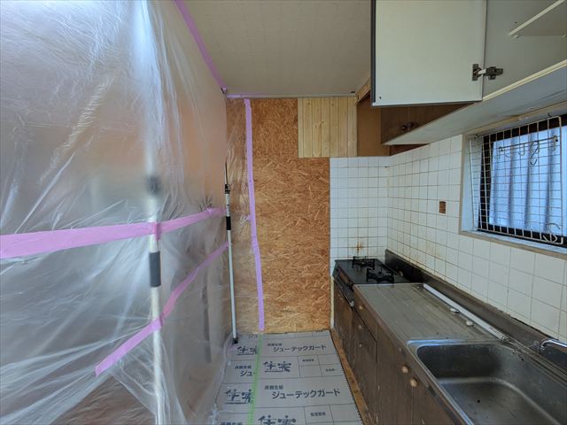 ダイニング側に埃や粉塵が飛ばないように壁にカーテン状の養生を施工します。